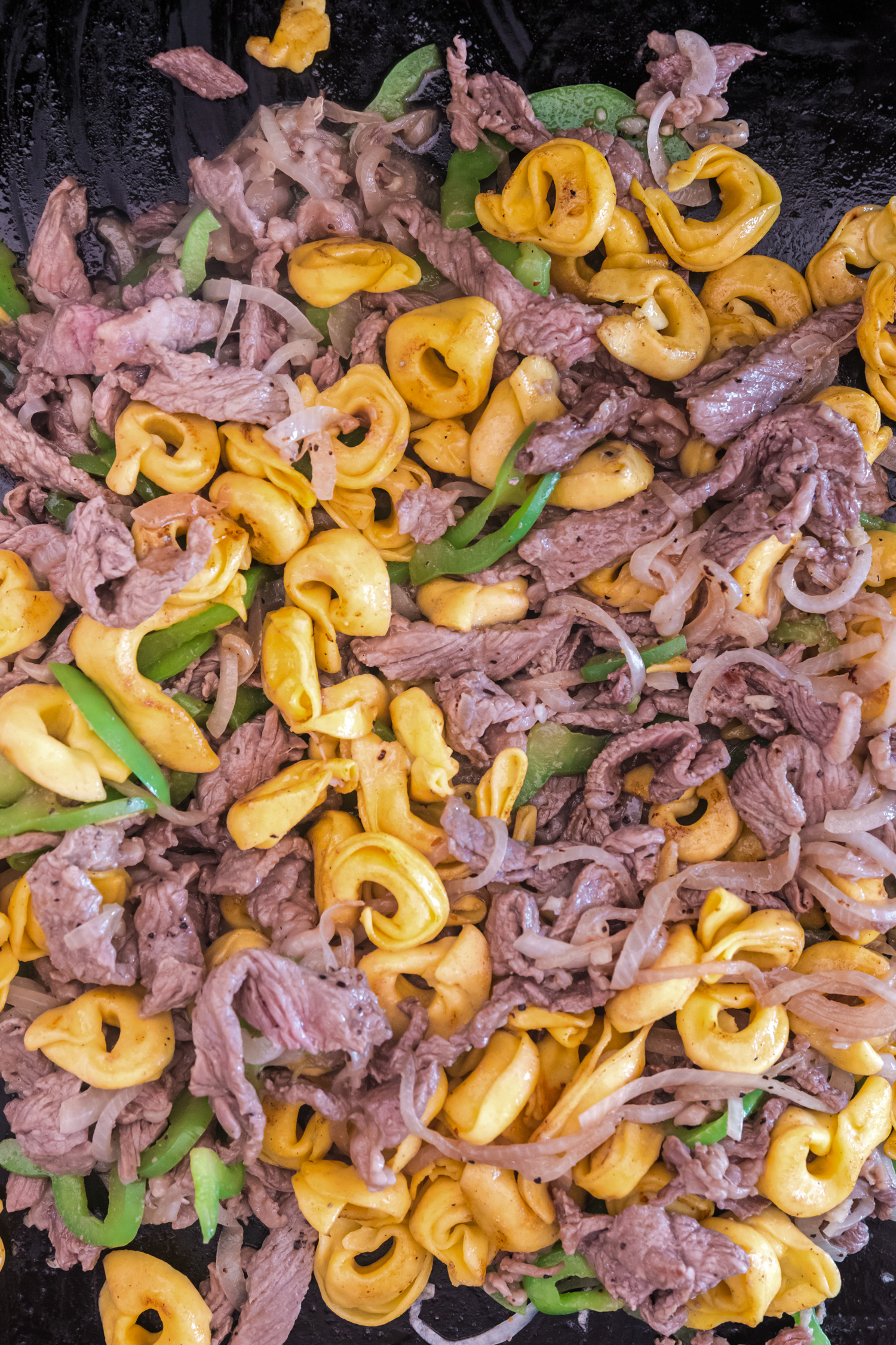 - Seasoned, shaved steak mixed with onions, peppers and cheese tortellini is a killer combination that your entire family is going to love.