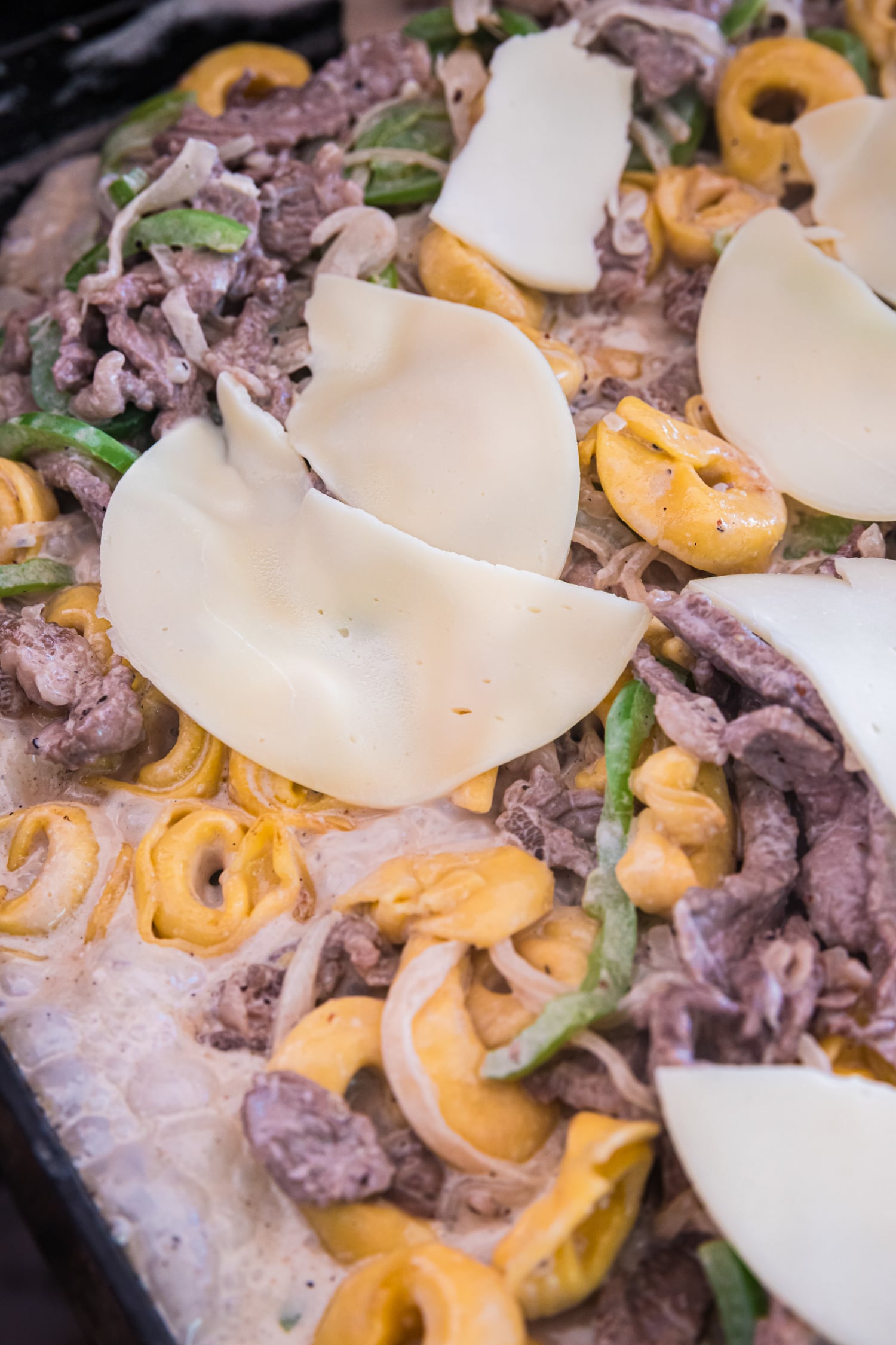 - Mix the tortellini and the steak mixture together then drizzle the heavy cream over top, stirring to combine. Add the sliced provolone on top of the steak and veggie mixture and cook for 2-3 minutes until cheese melts.