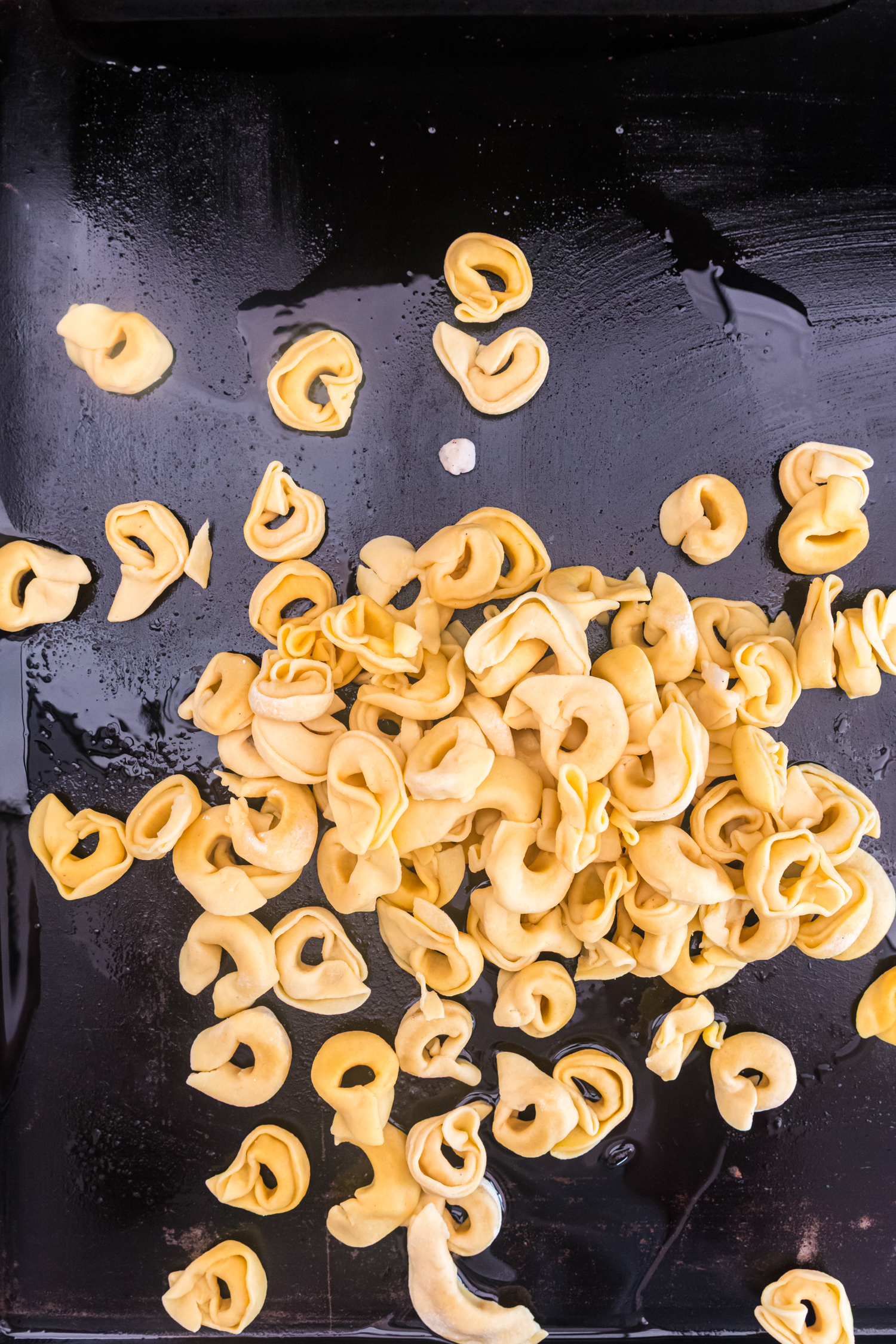 - Preheat Blackstone griddle to medium heat for a few minutes. Add 2 tablespoons of olive oil and the thawed tortellini to the griddle.