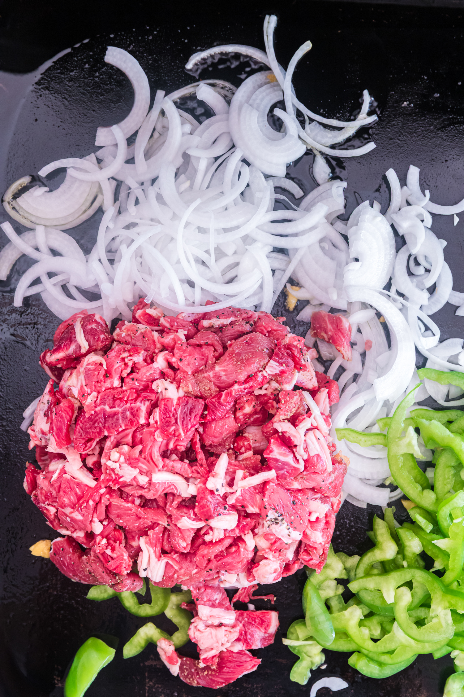 - Olive oil – This is used on the Blackstone griddle to cook the beef and veggies. You can use any oil with a high smoke point such as canola or vegetable if you prefer.
