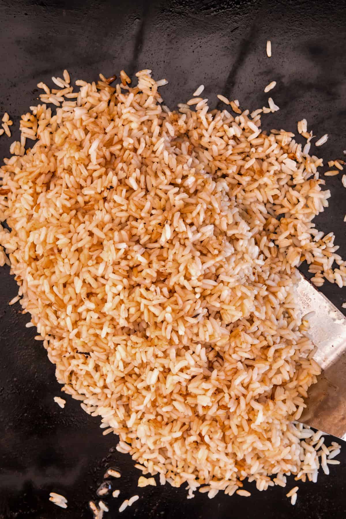 Absolutely! In fact, it’s quite similar to the process used in a hibachi restaurant. Cooking things like fried rice and stir fry on a flat top griddle makes it really easy to evenly cook the food and ensure that the flavors are even throughout the dish too. It’s our favorite way to cook fried rice!